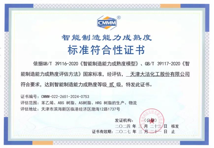 近日,天津大沽化工股份有限公司正式通过智能制造能力成熟度(CMMM)二级标准符合性认证,这是公司继去年取得数据管理能力成熟度二级评估后的又一显著成果。此次认证的取得不仅标志着大沽化工在智能制造方面达到了新高度,也对公司推进数字经济赋能传统产业,加快形成新质生产力,产生了更加积极的影响。