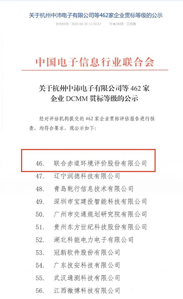 在数字化浪潮席卷全球的今天,数据已成为企业发展的核心资产和战略资源。经过长期的精心筹备与不懈努力,联合赤道环境评价股份有限公司凭借扎实的数据管理基础、科学的管理体系和卓越的实践成果,于2025年6月30日成功通过数据管理能力成熟度评估模型(DCMM)认证!这一里程碑式的突破,不仅是对联合赤道数据管理能力的高度认可,更标志着联合赤道在数字化转型的道路上迈出了坚实且意义非凡的一步!