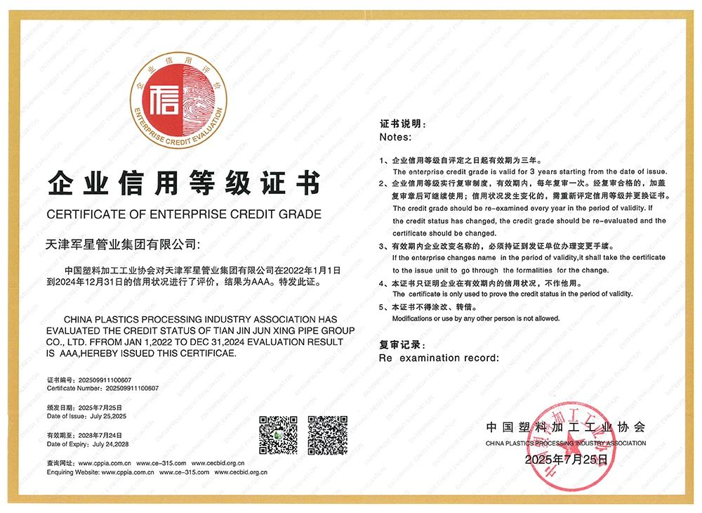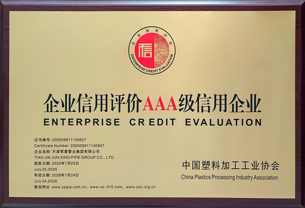 日前,天津军星管业集团有限公司再次被中国塑料加工工业协会认定为企业信用评价AAA级信用企业,当前“AAA”为最高信用等级。