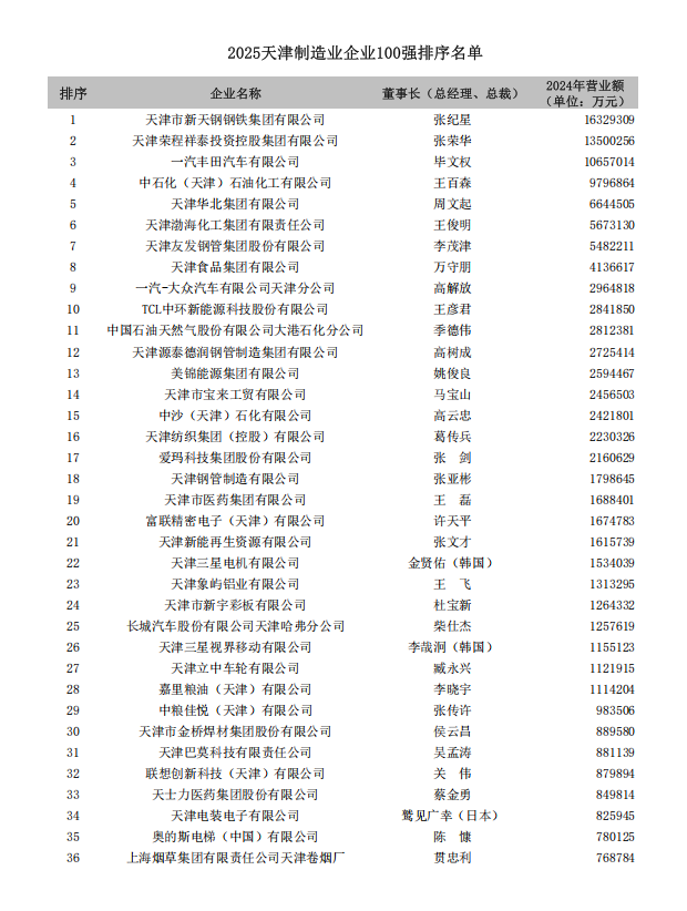 2025年天津制造业企业100强排序名单